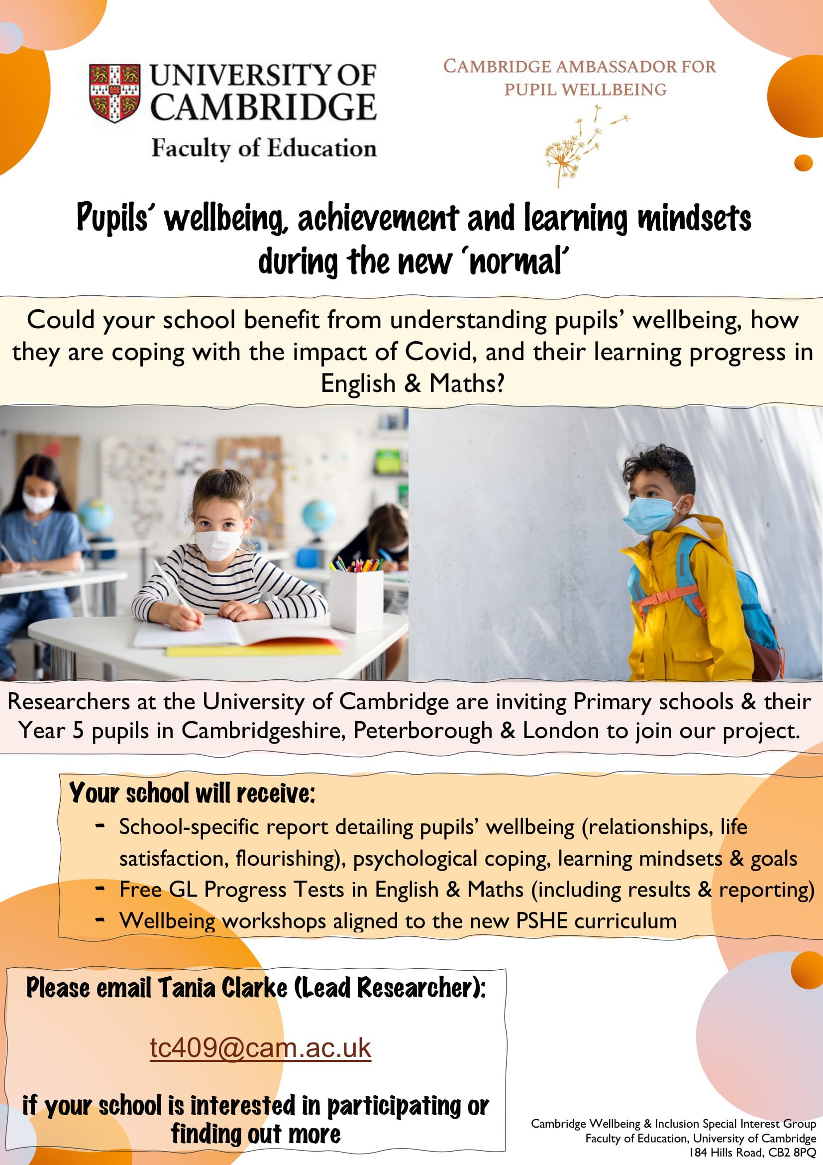 Primary schools anywhere in Cambridgeshire, Peterborough and London are invited to participate in the project. Schools will be required to facilitate the completion of a 30-minute questionnaire and two 60-minute standardised tests (in English and Maths) by their Year 5 pupils. The opportunity to then engage in wellbeing workshops will follow in 2021. For further details about how your school could benefit from joining, please contact Tania Clarke at tc409@cam.ac.uk