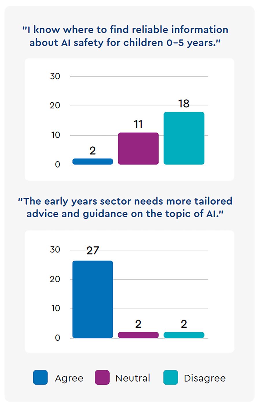 Nearly 50% of early years practitioners surveyed said they did not know where to find reliable AI safety information for young children, and 69% said the sector needed more guidance. They also raised concerns about safeguarding and affordability, with some fearing AI toys could widen the digital divide.